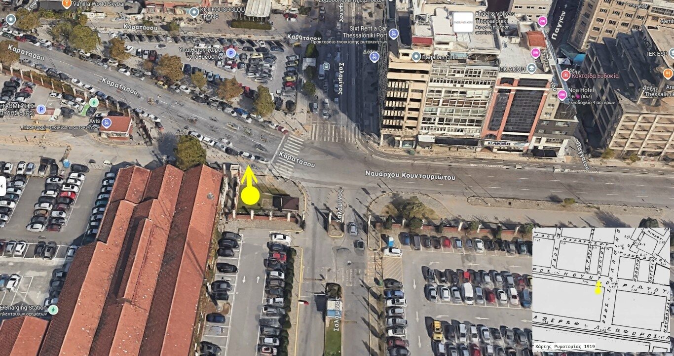 Η θέση του φωτογράφου στη σύγχρονη ρυμοτομία. Στον κίτρινο κύκλο προσδιορίζεται η λήψη κατά προσέγγιση, με κατεύθυνση το βέλος. Το παλαιό οικοδομικό τετράγωνο 71 έχει πλήρως ρυμοτομηθεί μετά την εφαρμογή του νέου πολεοδομικού σχεδίου της πόλης.