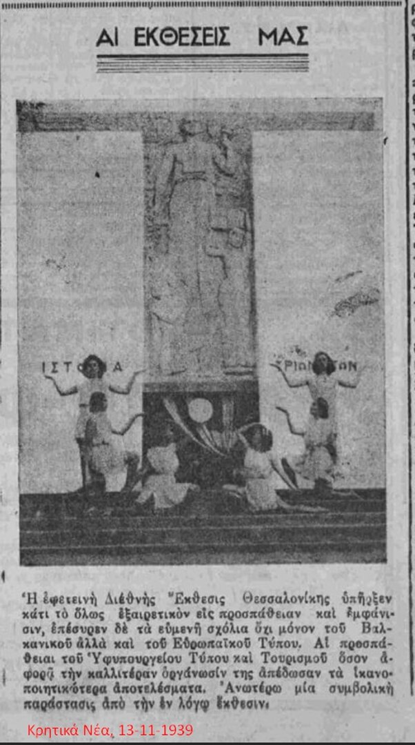 «Μία συμβολική παράστασις από την εν λόγω έκθεσιν», καταλήγει η λεζάντα αυτής της φωτογραφίας που δημοσιεύτηκε στο πρωτοσέλιδο της εφημερίδας Κρητικά Νέα του Ηρακλείου, στις 13 Νοεμβρίου 1939 και δείχνει κάτι που μοιάζει με ταμπλώ βιβάν -χαρακτηριστικό της αισθητικής της εποχής.