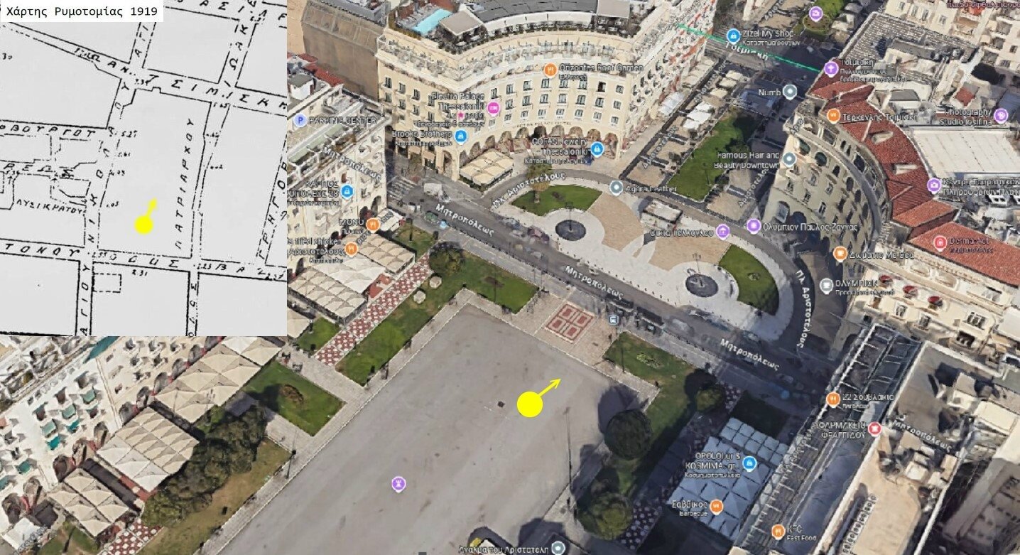 Το μυστήριο πίσω από μια φωτογραφία που εμφανίστηκε σε διαδικτυακή δημοπρασία λύθηκε χάρη σε μια παλιά, γνωστή αεροφωτογραφία. Αυτή η αεροφωτογραφία, που εκδόθηκε ως καρτ-ποστάλ κατά τον Α΄ Παγκόσμιο Πόλεμο, αποκαλύπτει την τοποθεσία του φωτογράφου. Βρισκόταν στο παλαιό οικοδομικό τετράγωνο 71, στην καρδιά της πόλης, στη σημερινή Πλατεία Αριστοτέλους, ακριβώς νότια της οδού Μητροπόλεως.