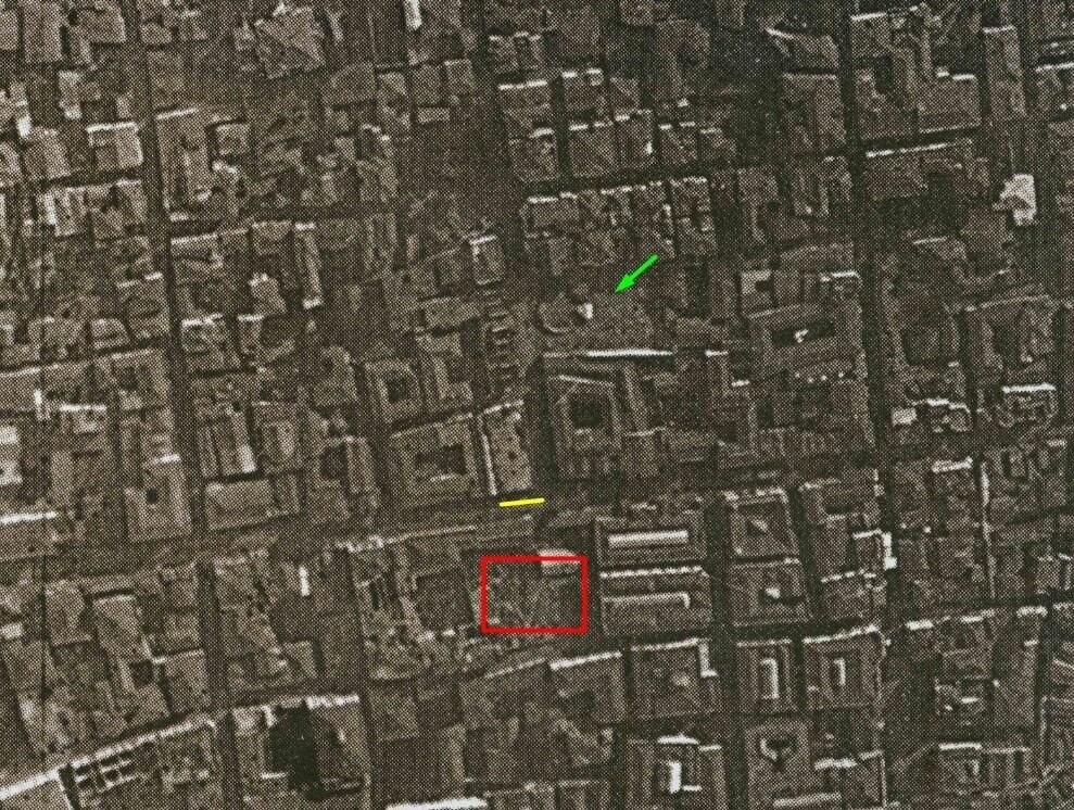 Στην αεροφωτογραφία πριν τη φωτιά του 1917 [Από Α. Γερόλυμπου, το χρονικό της μεγάλης πυρκαγιάς] σημειώνουμε γνωστά κτίρια που γλίτωσαν από τη φωτιά, τους αριθμούς των παλιών Οικ.Τετραγώνων και το «Κατούνη» σε κόκκινο κύκλο. Οι ροζ γραμμές δείχνουν στο περίπου τι έφαγε η νέα ρυμοτομία -ο νέος χάρτης της περιοχής είναι δεξιά. Δυστυχώς, η αεροφωτογραφία του 1938, δεν είναι σε τόσο καλή ανάλυση ώστε να δούμε αν υπάρχει κομμάτι του παλιού (προ της φωτιάς) κτιρίου στο «νέο» ή αν μεσοπολεμικά χτίστηκε εξ ολοκλήρου απ’ την αρχή.