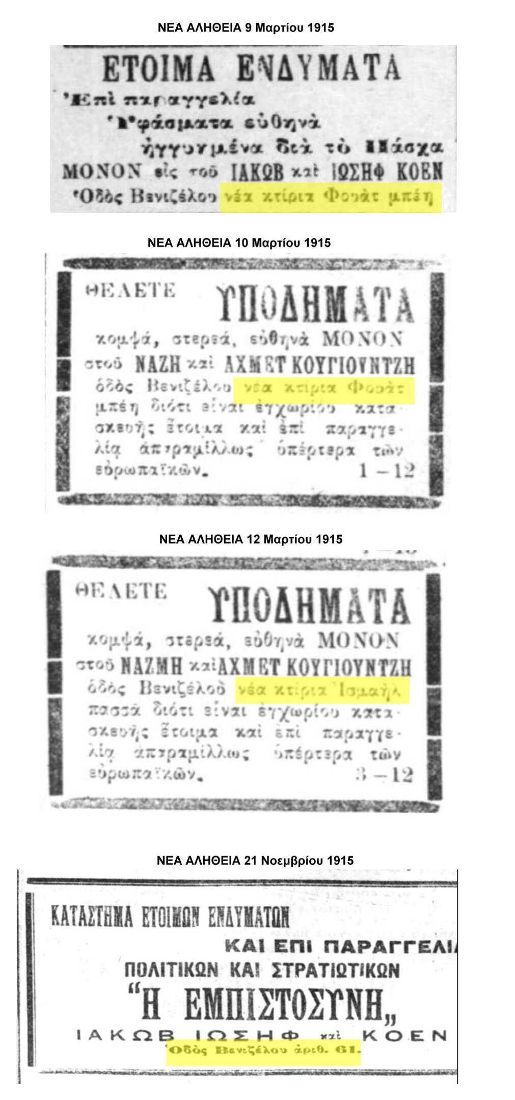 Στις αναρτήσεις της Κ. Τσιρέλη και της Γ. Ταβλαρίδου αναφέρεται η Τράπεζα Μυτιλήνης (όπως και στην πηγή) χωρίς εντοπισμό διεύθυνσης. Πιο κοντά πέφτει η ανάρτηση του Β. Χατζηκωνσταντίνου (22/4/2021) που αναφέρει ότι βρισκόταν στην Β. Ηρακλείου -αλλά το πηγαίνει λίγο παραδίπλα, στο μεγάλο τότε οικοδομικό τετράγωνο του Αγ. Μηνά. Στην δική του έρευνα, πηγή γι’ αυτή την πληροφορία είναι το Εβραϊκό Μουσείο Θεσσαλονίκης.