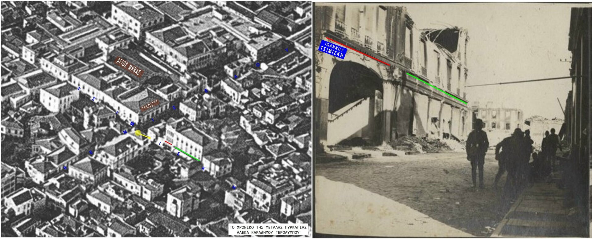 Η φωτογραφία συσχετίζεται με ένα απόσπασμα αεροφωτογραφίας που περιλαμβάνεται στο βιβλίο της Αλέκας Γερόλυμπου, “Χρονικό της Μεγάλης Πυρκαγιάς”.