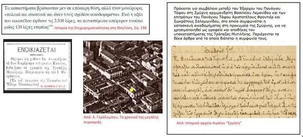 Τι μεσολάβησε και από τις παράγκες που άφησε ο Κατούνης φτάσαμε στο διώροφο χάνι της αγγελίας του 1912 που σημειώνεται με κίτρινο στην αεροφωτογραφία; Μα η Τράπεζα Μυτιλήνης, φυσικά, και η συμφωνία για την ανέγερση του νέου κτιρίου των γραφείων της! Είδαμε στην άλλη ανάρτηση τα περί «ειδικής κατασκευής» του κτιρίου. Τώρα βλέπουμε ότι η Τράπεζα Μυτιλήνης είχε προχωρήσει, το 1902, σε αντίστοιχη συμφωνία με την Εξαρχία του Παναγίου Τάφου στην Σμύρνη για το εκεί υποκατάστημά της. Αντιγράφω τη σύνοψη του τεκμηρίου από το αρχείο «Εργάνη» και ένα άρθρο από το συμβόλαιο, ενδεικτικά. Μπορείτε να το διαβάσετε ολόκληρο εδώ: [https://www.ergani-repository.gr/ergani/handle/11219/767?fbclid=IwY2xjawPTmHZleHRuA2FlbQIxMABicmlkETE5RWJtWVZYVUpBSUZaSnFZc3J0YwZhcHBfaWQQMjIyMDM5MTc4ODIwMDg5MgABHi81ezwLWgMOJ_Bzz3-Zkx30AS4B2gCog3k0eswQeeOU4U5tUKl6sUD-H25X_aem_kP8iFHsMACZMGTnA5fU9aA] Κάπως έτσι, υποθέτω, θα ήταν και το συμβόλαιο της Θεσσαλονίκης.