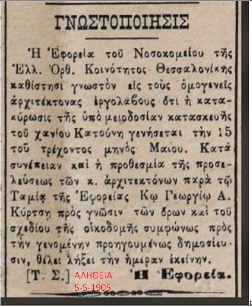 Πολύτιμη συνεισφορά της Σοφίας Δημουλά το απόκομμα της εφημερίδας “Αλήθεια”. 5/5/1905 Στην “Αλήθεια” η Εφορεία του Νοσοκομείου της Ελληνορθόδοξης Κοινότηας γνωστοποιεί ότι ημερομηνία κύρωσης του μειοδοτικού διαγωνισμού για την κατασκευή του χανίου Κατούνη είναι η 15 Μαϊου. Την ίδια μέρα λήγει και η προθεσμία για τους αρχιτέκτονες που ενδιαφέρονται να μάθουν τους όρους και το σχέδιο της οικοδομής. Από την ανακοίνωση είναι σαν να υπάρχει ήδη το σχέδιο -μήπως το «προμήθευσε» (ή έστω καθόρισε κάποιες προϋποθέσεις) η Τράπεζα Μυτιλήνης εάν είχε ήδη υπογράψει την σχετική συμφωνία; Και πάντως, αναφέρεται ότι έχει γίνει και προηγούμενη σχετική δημοσίευση. Ώρα για λίγη γκρίνια: είναι κρίμα που τα ψηφιοποιημένα φύλλα της εφημερίδας «Αληθεια» δεν είναι διαθέσιμα διαδικτυακά. Τα φύλλα που υπάρχουν στο culture.thessaloniki του Δήμου ούτε μπορεί κανείς να τα κατεβάσει, αλλά ούτε καν να τα διαβάσει.
