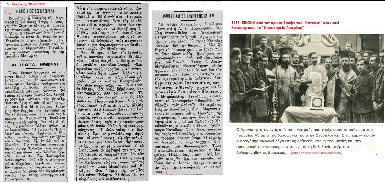Ψάχνοντας στην εφημερίδα Μακεδονία μήπως βρεθεί και εκεί κάτι σχετικό με την τύχη της αγγελίας του Οκτωβρίου 1912, βρίσκουμε-στις 30/12/1912- ένα μεγάλο ‘ρεπορτάζ’ από την επίσκεψη της Βασίλισσας και της Πριγκίπισσας Αλίκης στο Νοσοκομείο Δραγάση, που έχει μεταφερθεί εδώ και 3 βδομάδες, στον πρώην χώρο της Τράπεζας Μυτιλήνη. Δηλαδή, στο «Κατούνη» -δεν αναφέρεται ως τέτοιο, αλλά αυτό είναι. Το ρεπορτάζ δεν ξεκαθαρίζει αν ο χώρος ενοικιάζεται ή παραχωρήθηκε. Μάλλον το δεύτερο, αν κρίνουμε από το τελευταίο κοκκινισμένο σημείο του δημοσιεύματος.