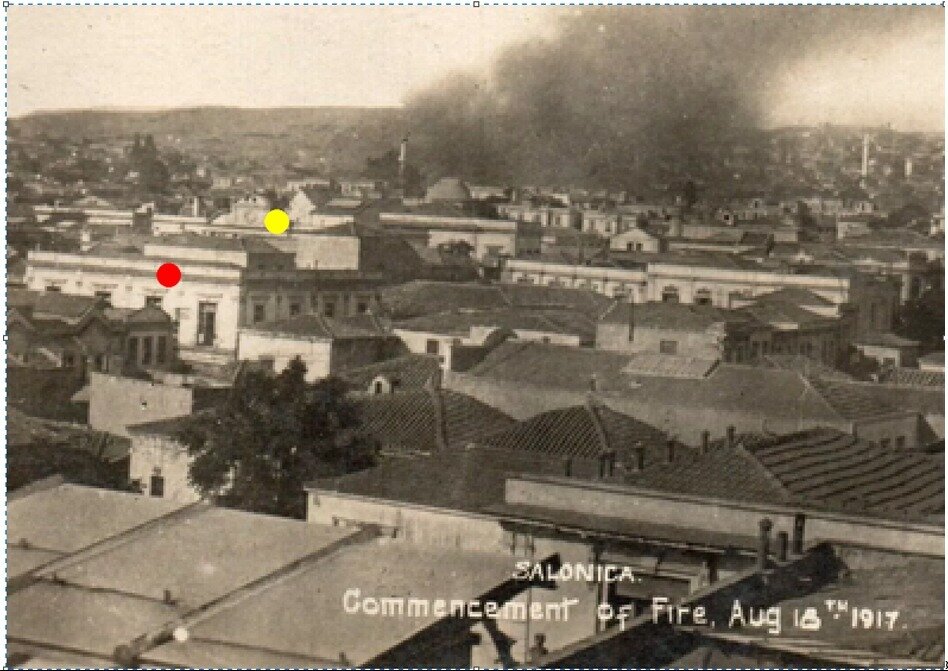 Η καλύτερη εικόνα του κτιρίου του 1906 (αυτού που στέγασε την Τράπεζα Μυτιλήνηςκαι το Νοσοκομείο Δραγάση) είναι μία από την έναρξη της φωτιάς, πριν ακόμα αυτή φτάσει στον Φραγκομαχαλά [από δημοπρασία του ebay]. Σημειωμένο με κόκκινο το Κατούνη, με κίτρινο η Στοά Μαλακοπή (Τράπεζα Θεσσαλονίκης).