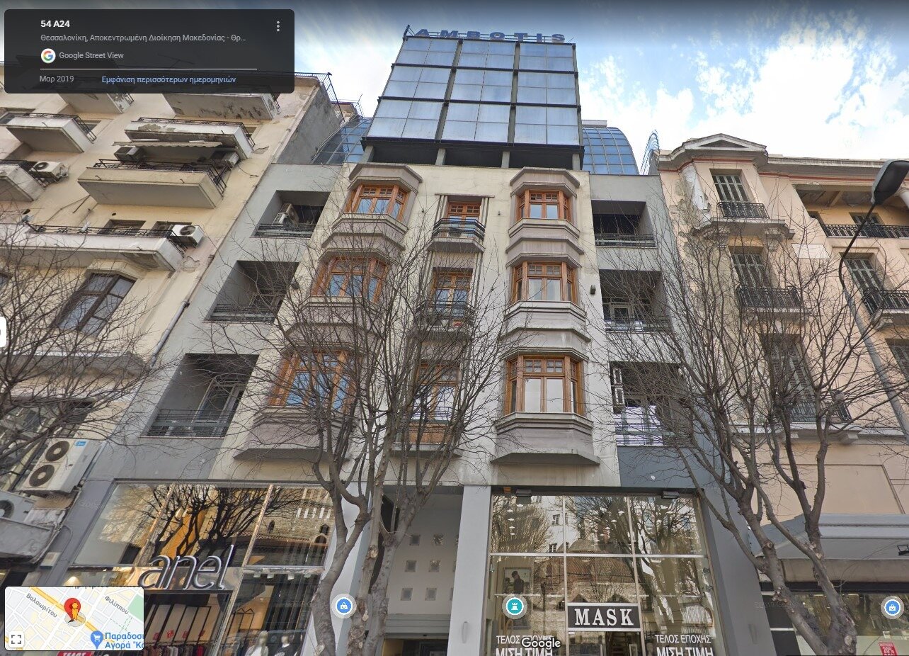 Εγνατίας 54, η μεσοπολεμική τετραώροφη πολυκατοικία από το 2002 παρουσιάζεται ως οκταώροφη, η ψηλότερη σε σχέση με τις όμορές της. Το γραφείο που ανέλαβε την ανακαίνιση ισχυρίζεται ότι επανέφερε το κέλυφος της οικοδομής στην αρχική του μορφή. Το σίγουρο είναι ότι ως προς τους μεσοπολεμικούς 4 ορόφους της άλλαξε η ισορροπία στα μήκη των μπαλκονιών και η επ' αυτών κατανομή των κουφωμάτων, αποκτώντας μια καινούρια εμφάνιση που θυμίζει την παλιότερη. Από κει και πάνω περνάμε σε άλλη εποχή, σε άλλο ύφος που έχει φυσικά ενδιαφέρον με τα πολλά ανοίγματα στο φως.