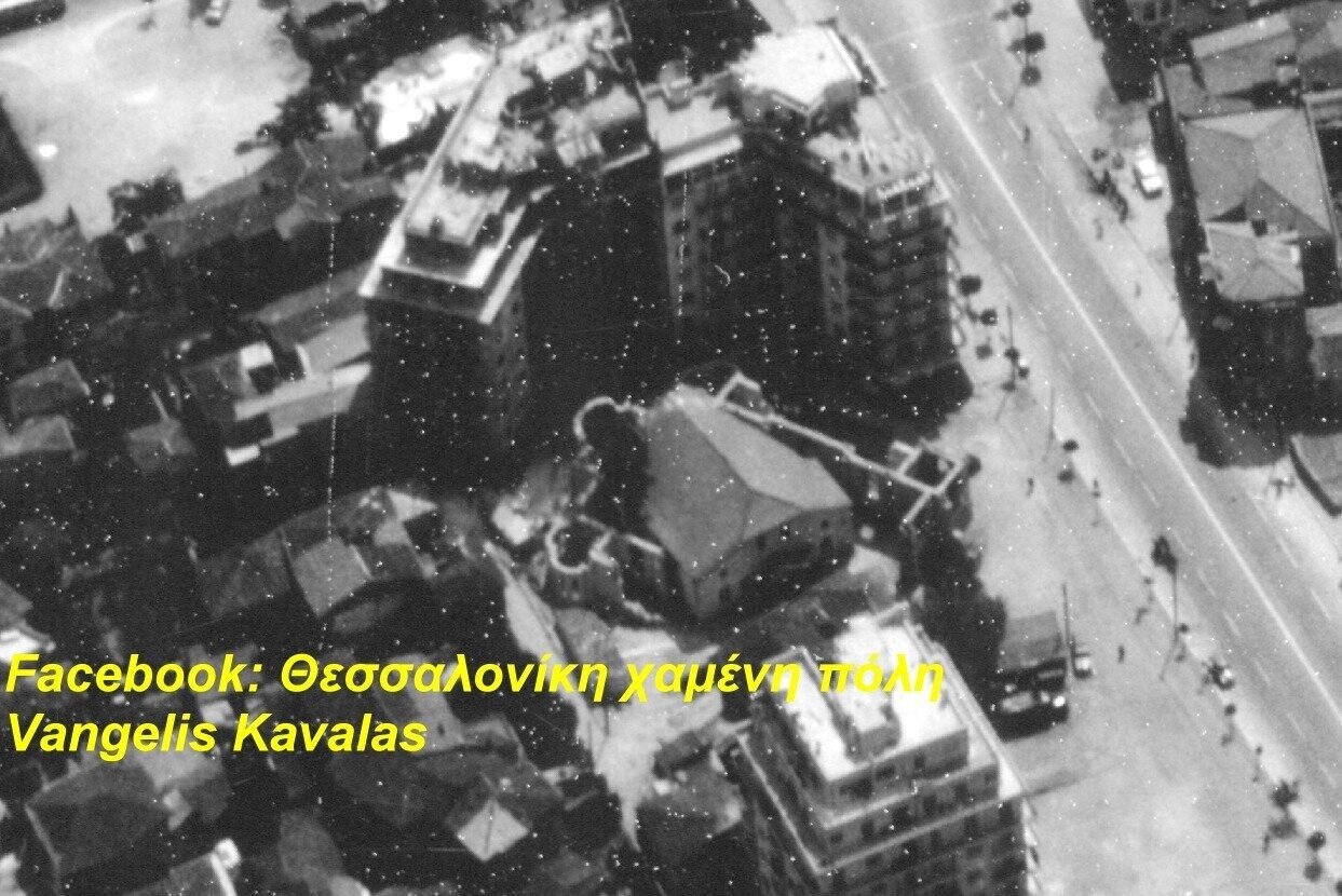 Η φωτογραφία είναι χρονολογημένη και τοποθετημένη από τον οίκο δημοπρασιών: Νοέμβριος 1956, Εγκαίνια ανέγερσης του Ναού της Παναγίας Δεξιάς. Μπροστά μας η οδός Αγ. Υπατίου και δεξιά η παλιά εκκλησία που φέρει πάνω της τις πινακίδες της κατάργησής της.