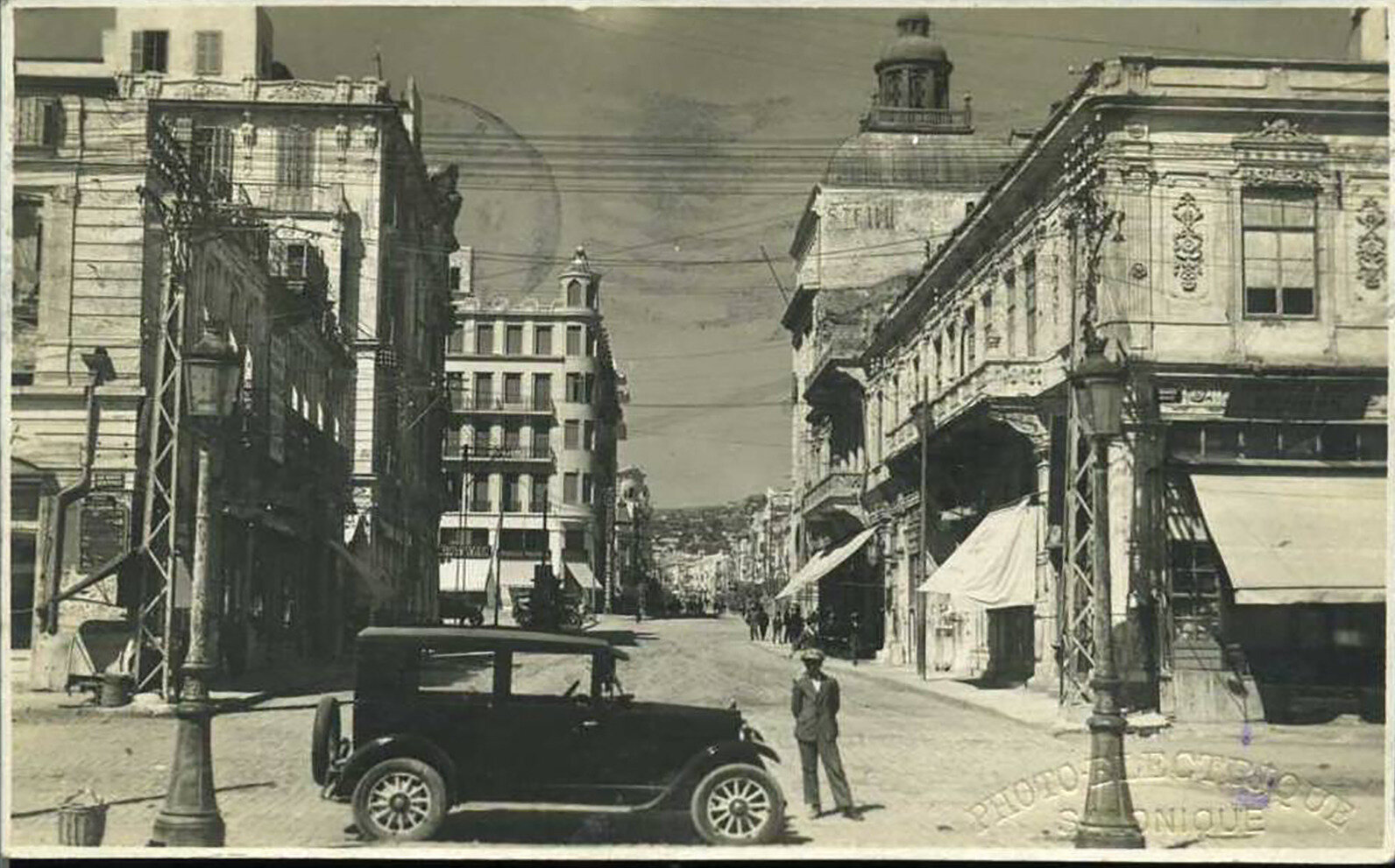 Από τα πιο γνωστά σύμβολα της Θεσσαλονίκης το Μέγαρο Στάιν και η πράσινη σφαίρα στην κορυφή του από γυαλί και μέταλλο. Η κ. Έλλη Γκαλά – Γεωργιλά έδειξε ότι δεν κατασκευάστηκε το 1906, όπως πιστευόταν παλιότερα, αλλά ολοκληρώθηκε το 1913 και δεν ανήκε στη αυστριακή εταιρεία Στάιν (προορίζονταν να στεγαστεί εκεί) αλλά στις συγγενικές οικογένειες Αγκιάχ και Χουλουσή, όπως και όλα τα οικόπεδα στην ανατολική πλευρά της πλατείας Ελευθερίας. Ειδικά το οικόπεδο όπου κτίστηκε το Μέγαρο Στάιν είχε ιδιοκτήτες τους αδελφούς Αλή και Χουλουσή μπέη, ο οποίος διατέλεσε και δήμαρχος της πόλης 1901-1908. Το κτίριο, αρχικά τετραώροφο, ανακατασκευαστηκε, παρόλο που δεν έπαθε ιδιαίτερες ζημιές από την πυρκαγιά, για να προσαρμοστεί στις ανάγκες της οικοδομικής γραμμής της Βενιζέλου και πήρε την οριστική του μορφή το 1937.