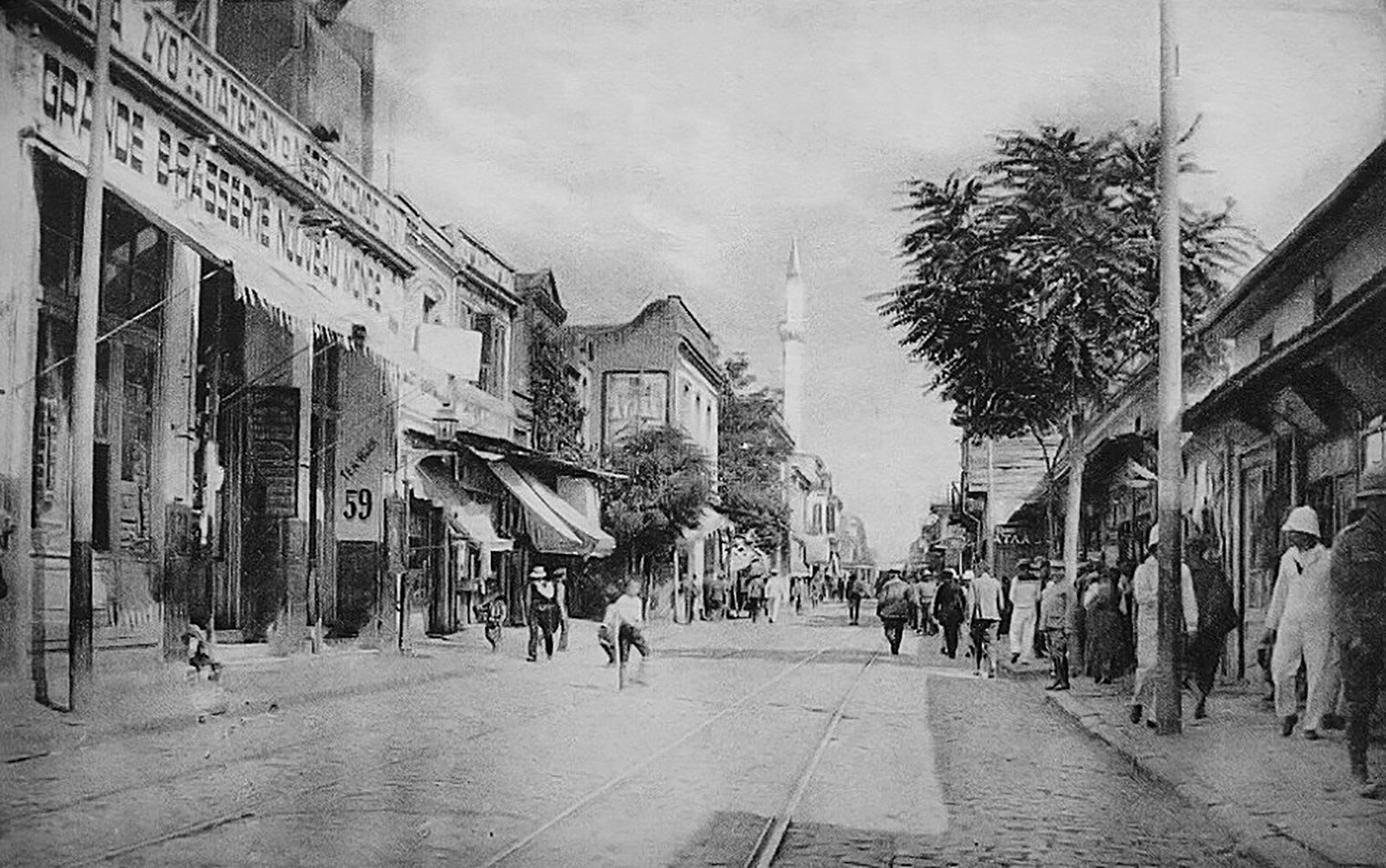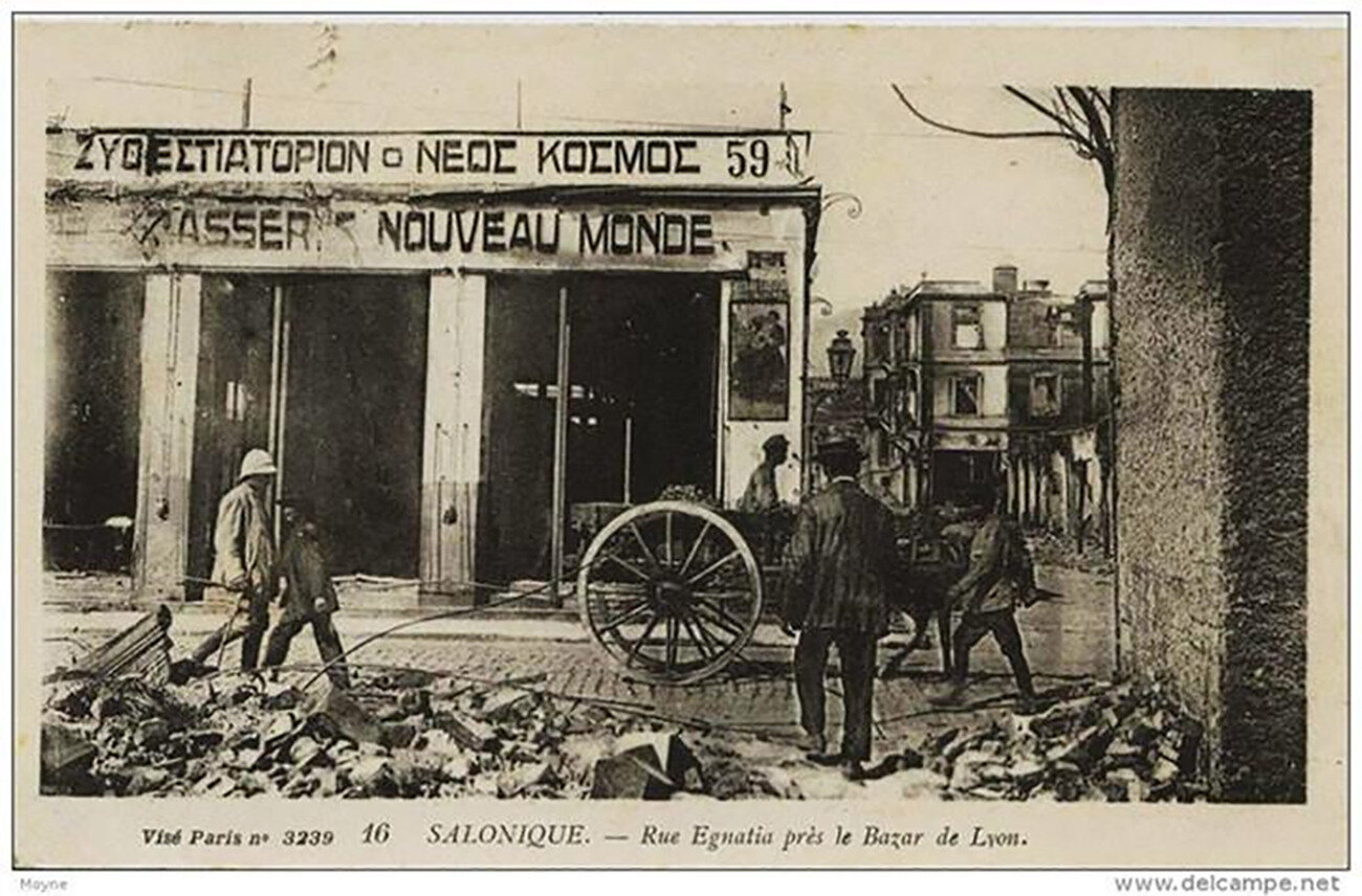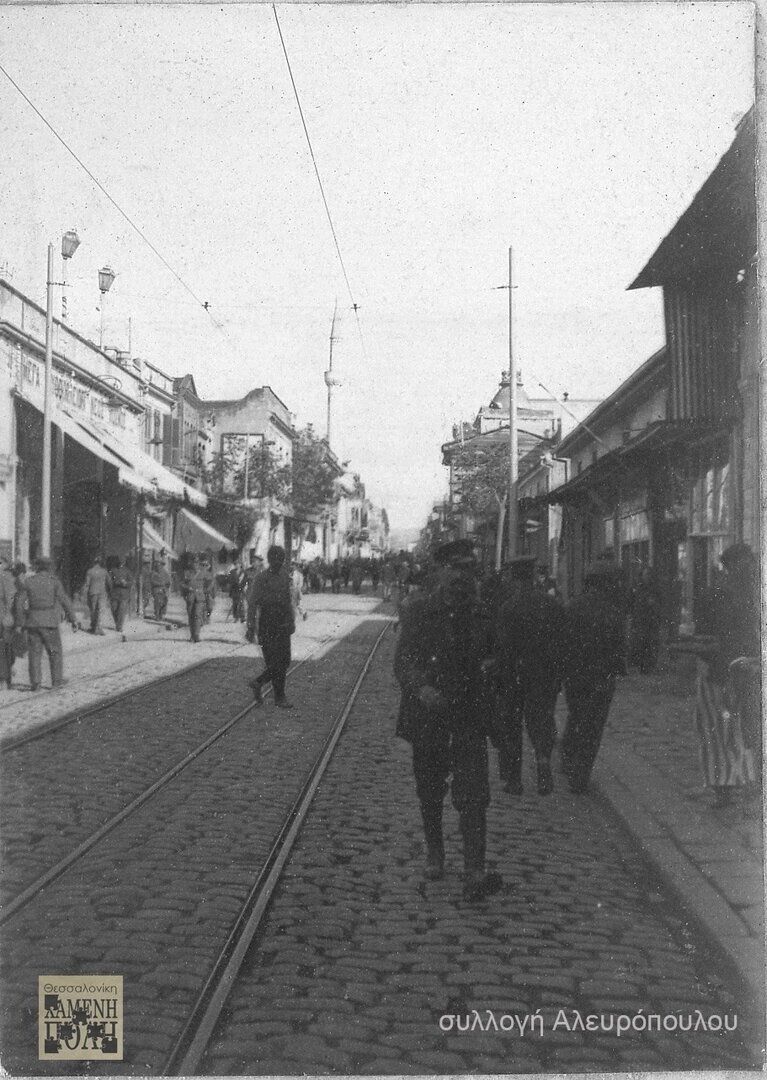 Η δεύτερη αυτή λήψη από το βιβλίο του Πετρόπουλου Old Thessaloniki, η ελληνική επιγραφή έχει μεταφερθεί στο γείσο του κτιρίου, χωρίς ακόμα την ονομασία.