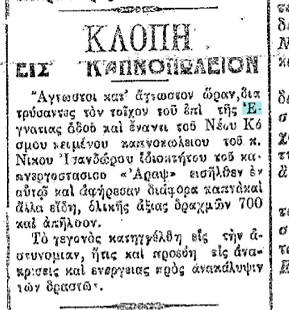 Στο καπνεργοστάσιο “'Αραψ” μια κλοπή. 7/2/1916